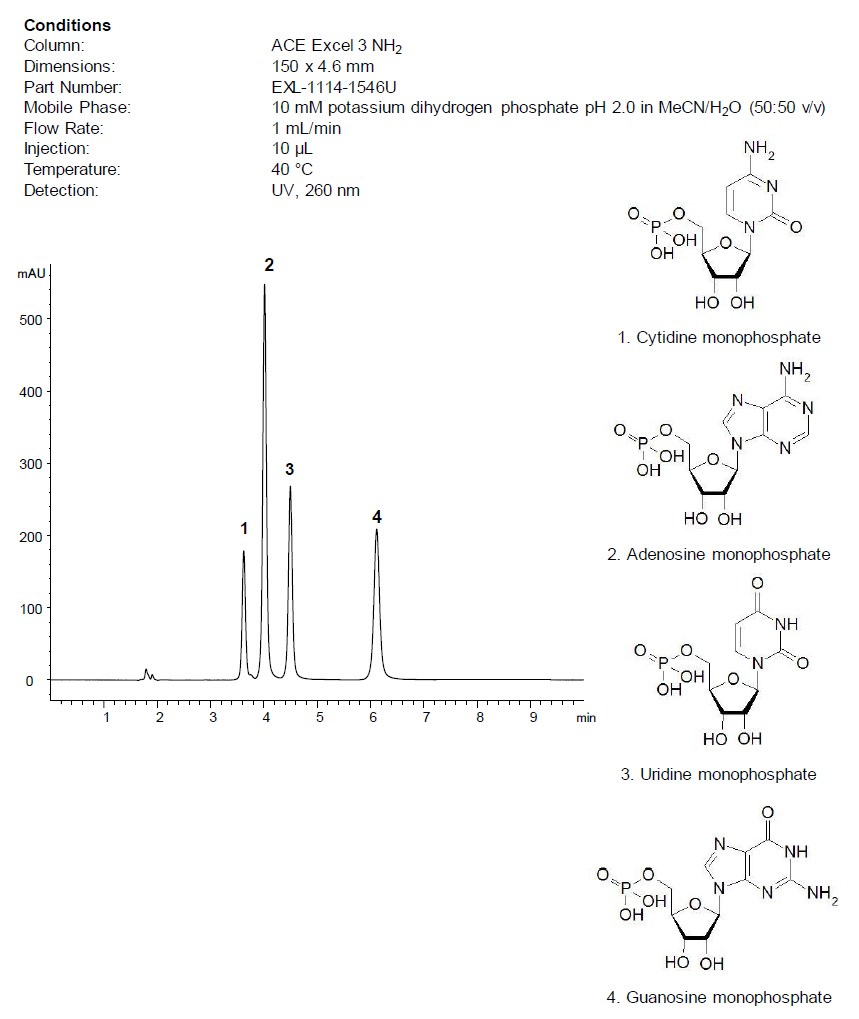 ACE HILIC-N是ACE三款親水作用色譜柱中的中性柱,相對于陰陽離子都顯示出較低的離子交換能力,通過極性相互作用、吸附和一定程度的分散(分配能力)來保留分離核酸堿基、核糖核苷和脫氧核糖核苷。