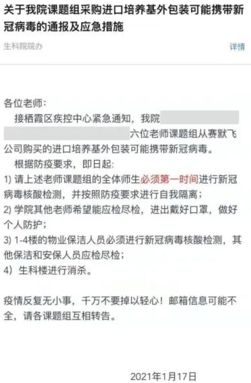 南京某高校群發(fā)郵件通知,該校生科院部分課題組采購(gòu)的進(jìn)口培養(yǎng)基外包裝可能攜帶新冠病毒,并要求這些課題組全部成員接受核酸檢測(cè)、自我隔離。
