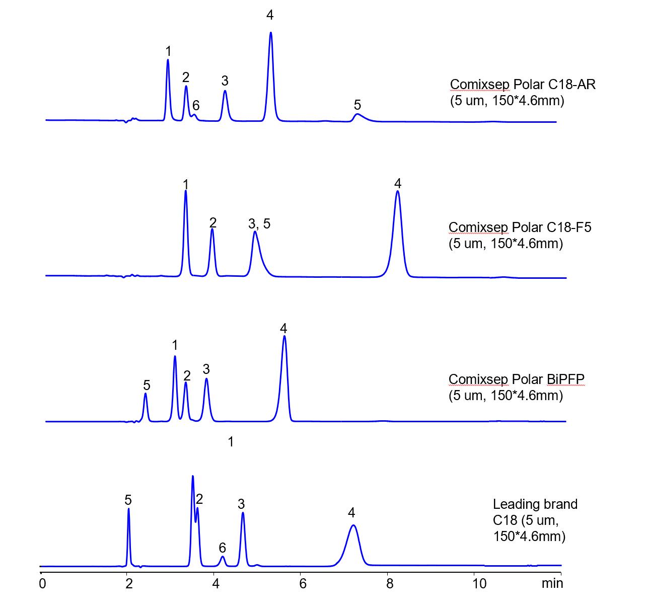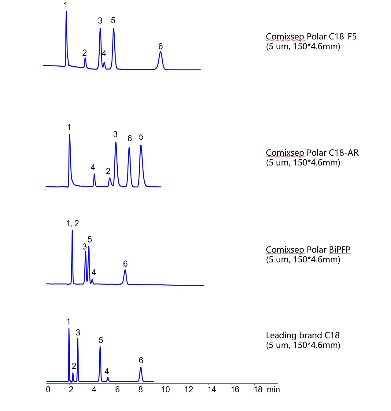 Comixsep復(fù)合反相固定相方法包為三款規(guī)格一致的互補固定相(Polar C18-F5, Polar C18-AR和Polar BiPFP)的組合,通過選擇性的科學(xué)互補,方便在HPLC方法開發(fā)時固定相的篩選,最大化提升方法開發(fā)的效率和成功率,是HPLC方法開發(fā)的有力工具。